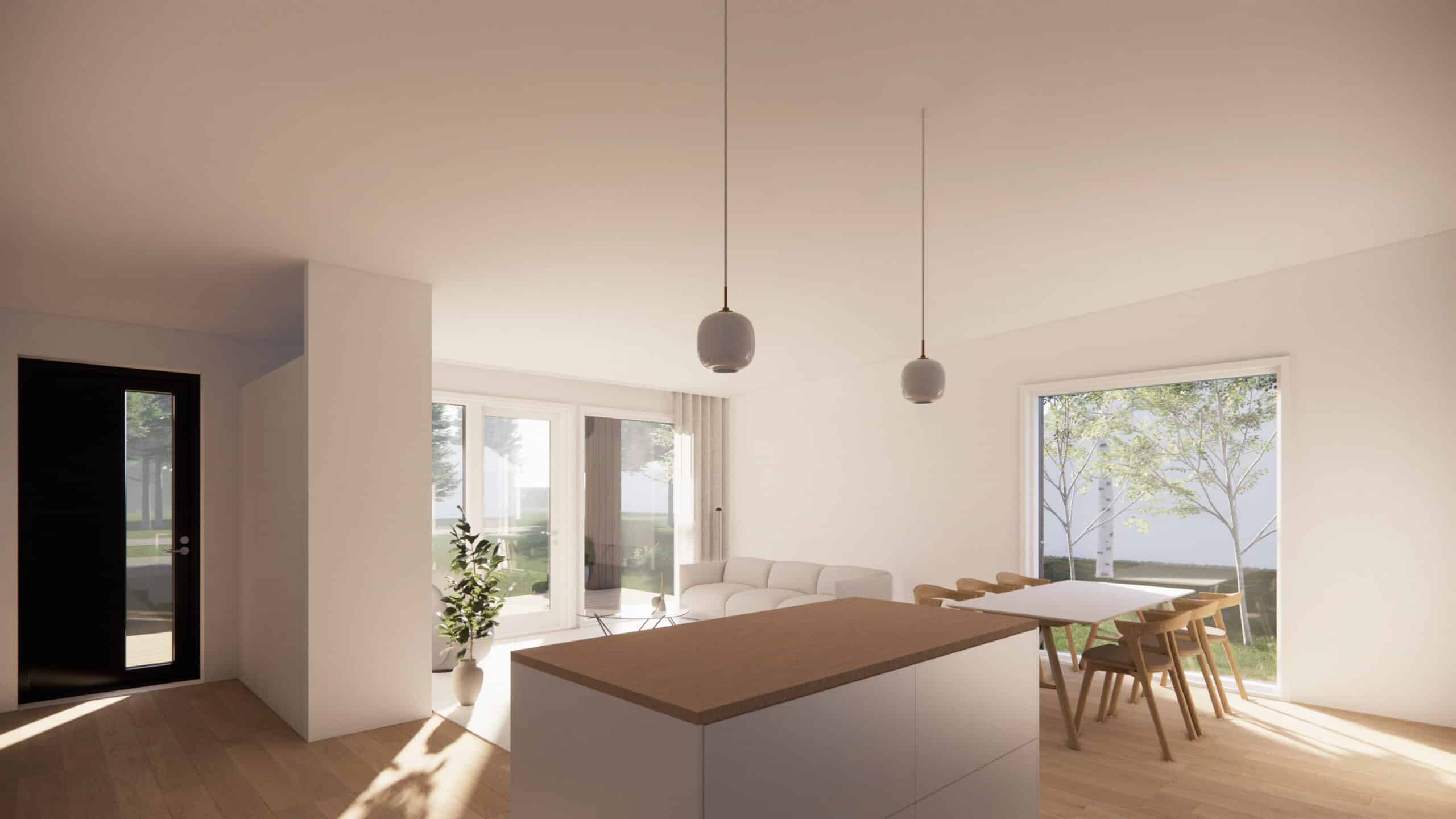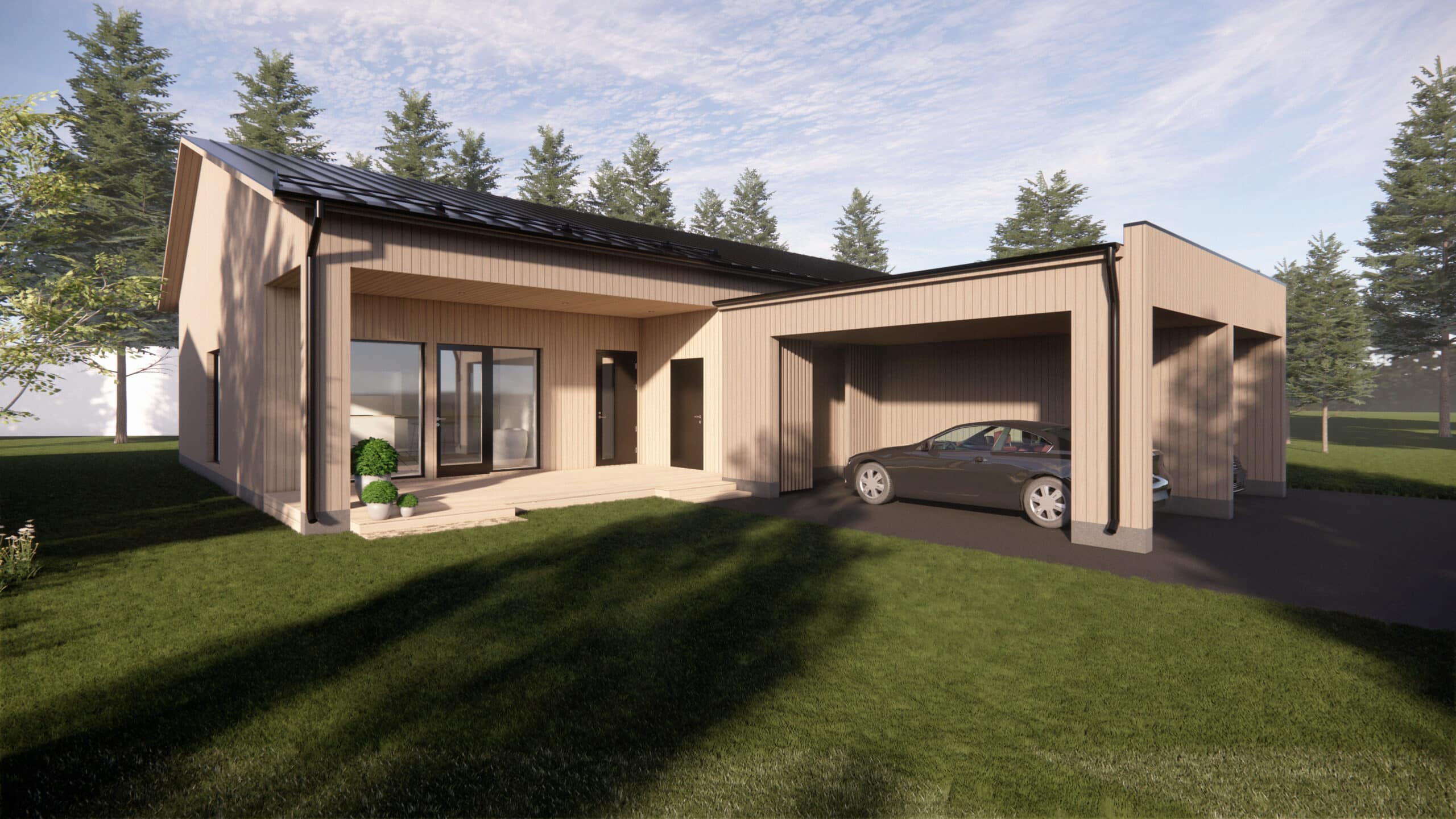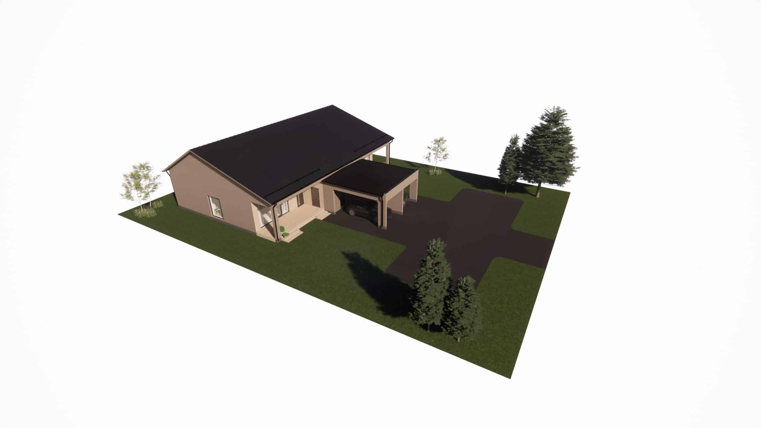 Tämä kolmen makuuhuoneen koti tarjoaa arjessa toimivat tilat unohtamatta viihtyisyyttä. Avarassa olohuone-keittiössä korotettu vino sisäkatto nousee noin kolmeen metriin. Isot ikkunat avautuvat avaralle eteläpihalle. Samalla puolella myös katettu terassi lasitusvarauksella.