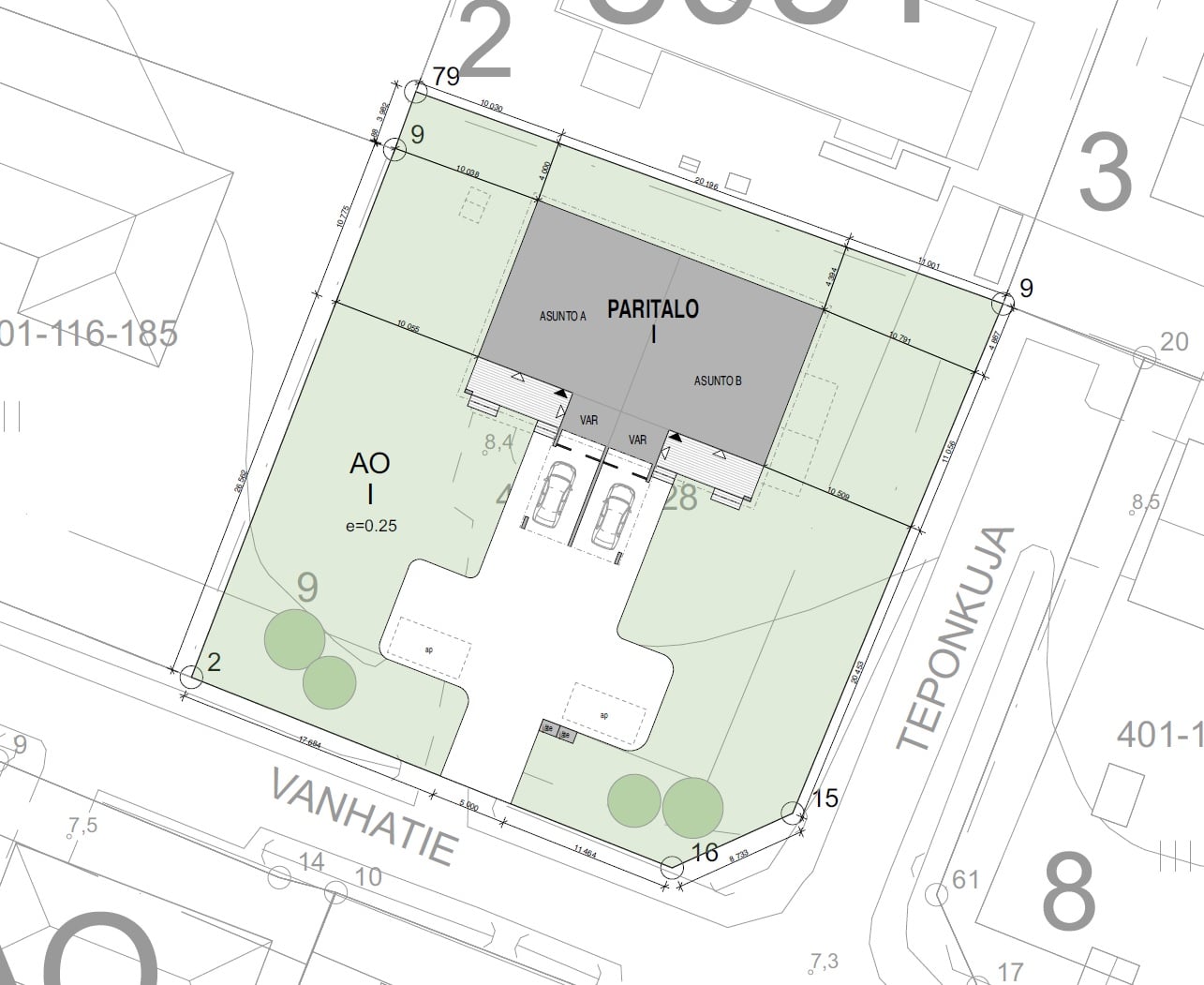 Kodit rakennetaan omalle 1689 m² kulmatontille. Tontti jaetaan hallinnanjakosopimuksella A- ja B-puolien kesken. Kaupat toteutetaan urakkasopimusmallilla, jossa tontti myydään kiinteistökauppana ja talo maksetaan maksuerissä valmiusasteen mukaisesti. Hinta sisältää kaikki rakentamiseen liittyvät kustannukset. Tonttiosuus 46 000 € ja urakkasopimuksen osuus 263 000 €. Varainsiirtovero (3%) maksetaan vain tontin osuudesta. Verohyöty tuo suoraa säästöä valmiiksi rakennettuun verrattuna 7890 €!