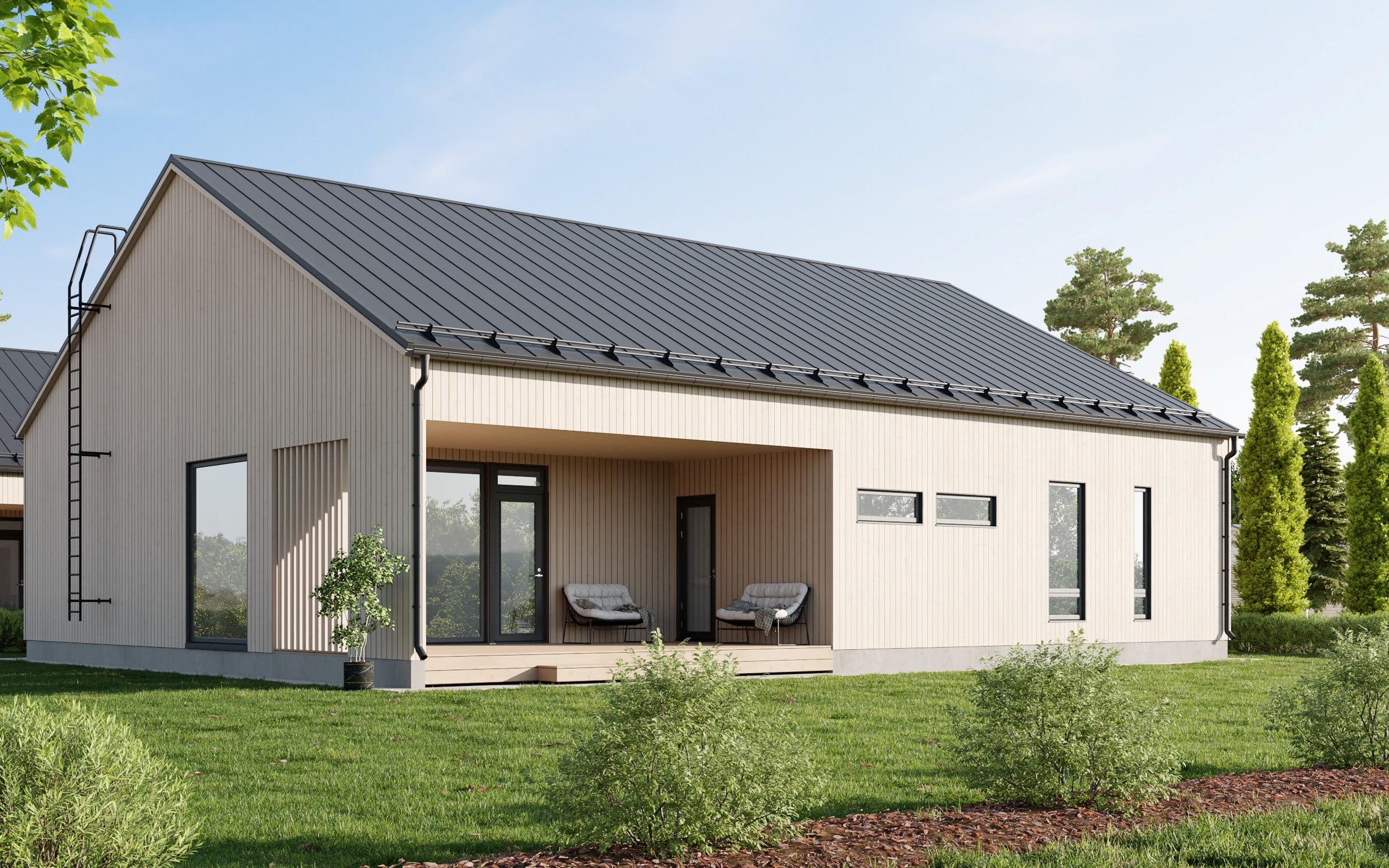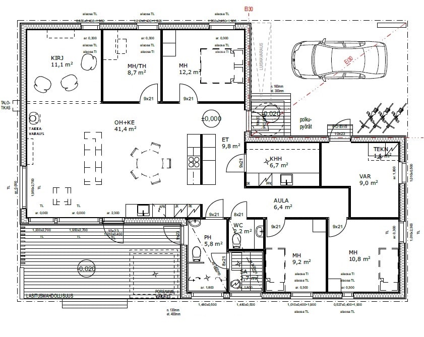 Tässä kodissa olohuone ja keittiö muodostavat kirjastohuoneen kanssa avaran yhtenäisen tilan. Isot ikkunat avautuvat ison katetun terassin puolelle. Neljä makuuhuonetta jaoteltuna eri kulmiin mahdollistaen omaa rauhaa. Lisäksi kirjastohuone, joka on jaettavissa esim. viidenneksi makuuhuoneeksi tai erotettavissa lasiseinällä. Huonekorkeus kodissa on noin kolme metriä.